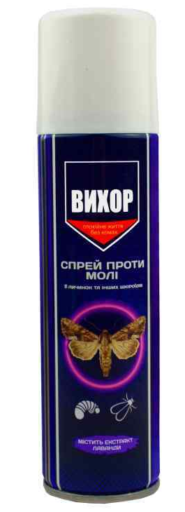Аерозольний засіб для знищення молі, її личинок та інших шкіроїдів. Містить екстрат лаванди. Немає різкого чи неприємного запаху. Завдяки зручній формі аерозолю швидко та рівномірно розподіляється по обробній поверхні.