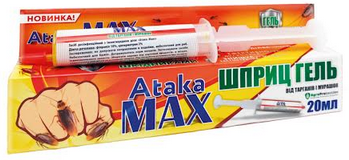 Шприц Атака Макс, виготовлений у формі гелю, застосовується для захисту житлових, виробничих і лікувально-профілактичних приміщень, складів, комор, підвалів, сховищ від усіх видів тарганів та мурах. Препарат Атака макс є отрутою нервово-паралітичної дії, під час потрапляння до організму комахи, засіб блокує рецептори центральної нервової системи та рухові центри комах, внаслідок чого у них розвиваються паралічі та конвульсії, які призводять шкідників до загибелі. При цьому видимі результати дії інсектициду проявляються протягом декількох годин після вживання принади. Повне знищення скупчення комах відбувається протягом 5-7 днів.