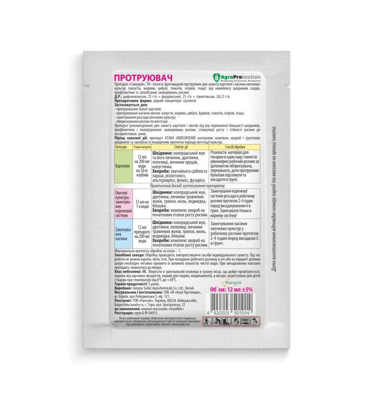 Препарат «Самурай», ТН - інсекто-фунгіцидний протруйник для захисту картоплі і насіння овочевих культур (капусти, моркви, цибулі, томатів, огірків, тощо) від комплексу шкідників сходів, профілактики та запобігання захворювань рослин.