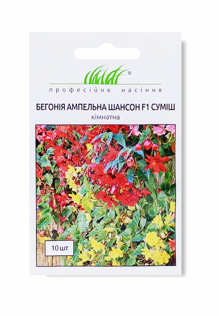 Шансон Суміш F1 - бульбова ампельна, гібридна, махрова бегонія. Це чудова бегонія з махровими і напівмахровими квітками червоного, жовтого, білого, помаранчевого кольорів. У рослини зазвичай 5-8 основних пагонів. У пазух кожного листа розташовані довгі квітконоси з квітками правильної форми діаметром 6-8 см; довжина від пагонів - 30-45 див. Кращий термін посіву насіння - середина грудня - перша декада січня. Сіють їх у неглибокі ящики, наповнені просіяної земляною сумішшю. Рясно цвітуть протягом усього сезону культивації. Стійкі до несприятливих умов. Квіти особливо придатні для вирощування в квіткових ящиках, у підвісних горщиках та скрізь, де вигідно проявляється звисаюча форма рослини.