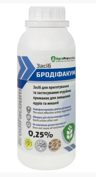 Засіб Бродифакум 0,25% - засіб призначений для приготування та застосування отруєних приманок для знищення щурів та мишей у практиці дератизації на об'єктах різних категорій.