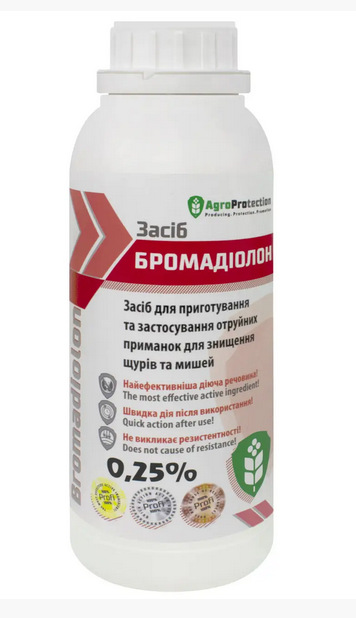 Засіб Бромадіолон 0,25%- засіб призначений для приготування та застосування отруєних приманок для знищення щурів та мишей у практиці дератизації на об'єктах різних категорій.
