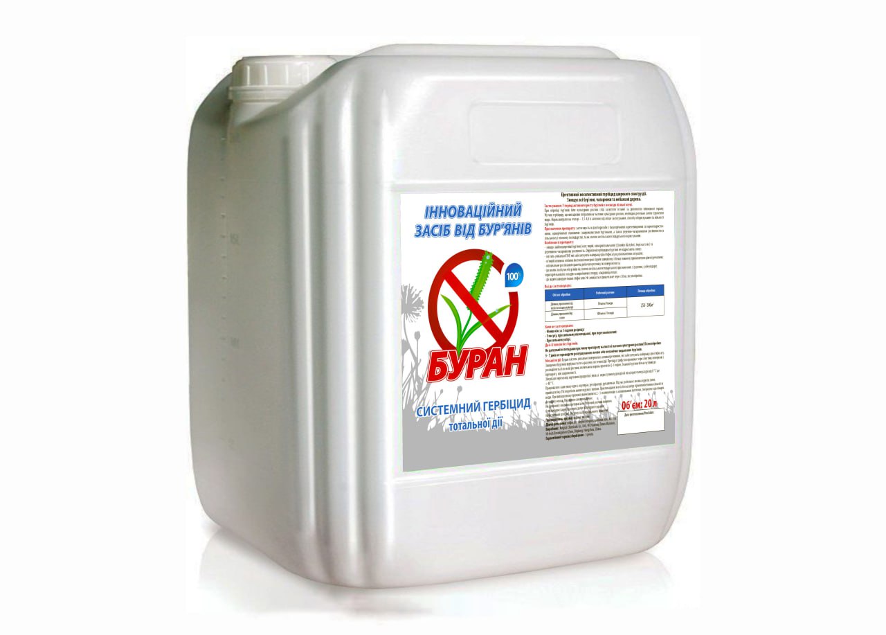 Буран 20л - Системний гербіцид суцільної дії, призначений для застосування на присадибних ділянках. Водний розчин.