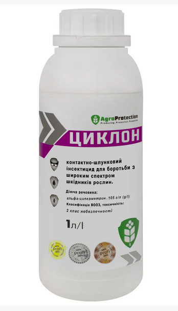 Інсектицид контактно-кишкової дії Циклон застосовується для обробки сільськогосподарських культур з метою захисту від широкого спектру комах-шкідників. Препарат містить у складі діючу речовину альфа-циперметрин, механізм дії якої полягає в порушенні функцій центральної нервової системи комах. Отруєння проявляється в пригніченні рухових центрів паразита, в результаті чого настає параліч і загибель шкідника. Даний засіб не має системної дії, проте препарат зберігається на оброблених поверхнях рослин тривалий час - до 3-х тижнів, оскільки має достатню стійкість до дії високих температур та ультрафіолетових променів. Засіб має високий інсектицидний вплив на всі стадії розвитку комах-шкідників: личинки, яйця та дорослих особин. Інсектицид Циклон успішно використовується для захисту яблуні, груші, персика, зернових колосових культур, ріпака, буряка цукрового, гороху, томатів проти клопа шкідливої ​​черепашки, п'явиці, трипсів, хлібної жужелиці, злакової мухи, ріпакового квіткоїда, хрестоцвітних блішок, різноманітних видів попелиць, горохової зернівки, плодожерки, лучного метелика, блішки, колорадського жука, листовійки.