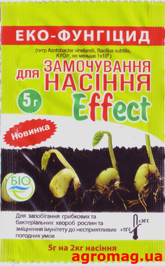 Біофунгіцид Effect - це універсальний препарат, призначений для обробки садів, виноградників і городів (в т.ч. плодів помідорів) з метою профілактики і лікування грибкових і бактеріальних захворювань рослин, одночасно служить для азотного - і фосфорного підживлення рослин. Біологічний метод боротьби з паразитами і шкідниками рослин заснован на існуючій в природі боротьбі між деякими мікроорганізмами, що живуть в грунті або на рослинах. Корисні бактерії (Azotobacter vinelandii, Bacillus subtilis), що входять до складу біофунгіциду Effect, є природними ворогами широкого спектру грибкових і бактеріальних захворювань: парші, зів'янення, чорної ніжки, фітофторозу, пліснявіння насіння, кореневих гнилей, гнилей сходів, борошнистої роси, бурої іржі, летючої сажки, пухирчастої сажки, альтернаріозу, ризоктоніозу, фузаріозу, септоріозу та багатьох інших. Число життєздатних клітин мікроорганізмів називається колонієутворююча одиниця - (КУО) - це життєздатна бактерія, яка, відтворюючись, може сформувати цілу колонію, якщо вона адаптується в живильному середовищі. Для біофунгіцид Effect це число - не менше 1,0 x 109 в 1 г препарату.