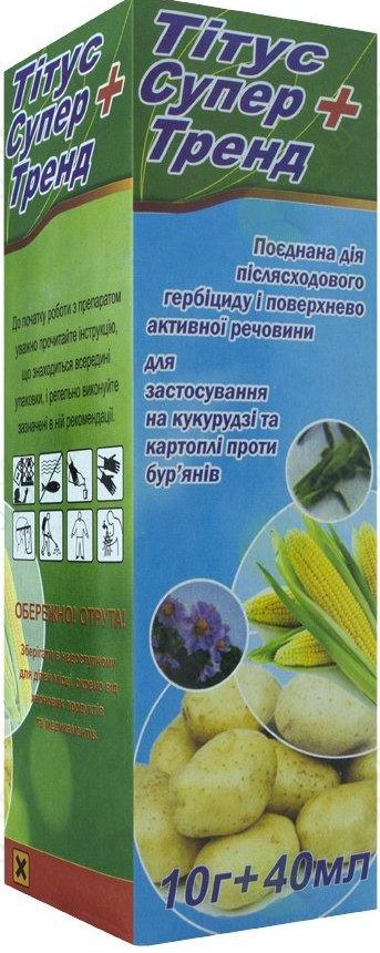 Післясходовий, системний гербіцид виборчої дії Титус у комплекті з прилипачем Тренд застосовується для обробки посівів кукурудзи та картоплі після сходів культурних рослин (у фазі 2-6 листків) проти однорічних та багаторічних злакових та дводольних бур'янів.