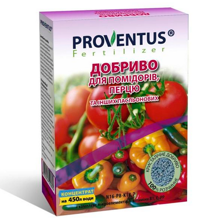 Провентус- кристалічне добриво для помідорів та перцю (300 гр) - високоефективне, концентроване, мінеральне добриво, що містить всі необхідні для живлення рослини елементи в доступних формах.