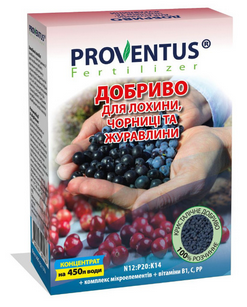 Добриво Провентус з NPK 12:20:14 спеціально створено для фруктових і ягідних кущів, таких як малина, смородина, аґрус, айва, шипшина, лохина, чорниця, клюква. Даний препарат це якісне, концентроване, мінеральне добриво, містить усі необхідні елементи для харчування рослин у доступних формах. Добриво забезпечує здорове харчування для рослин і може використовуватись у будь-якій системі полива, у тому числі крапельне зрошення, вологість, гідропоніка та інші рослини. Так само препарат усуває наслідки від впливу гербіцидів та несприятливих погодних умов, збільшує стійкість рослин до хвороб і внаслідок цього в 1,5 - 2 рази збільшується врожай.