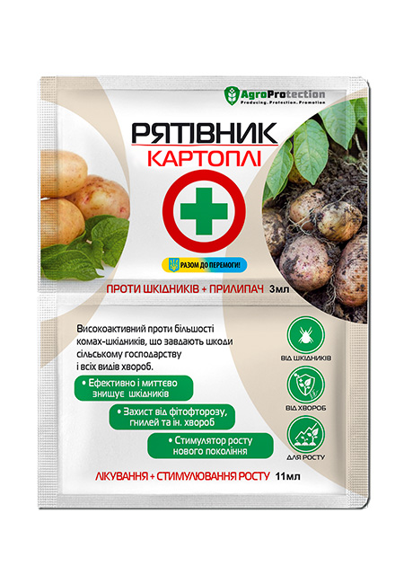 ЧОТИРЬОХкомпонентний комплескний засіб для захисту картоплi «РЯТІВНИК» від переважної кількості шкідників та всіх видів патогенних організмів (хвороб).