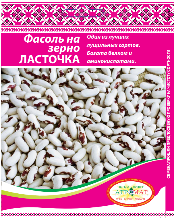 Один з кращих лущильних сортів. Рослина низька, міцна, раннього строку дозрівання. Боби довжиною 12-15 см, прямі, добре наповнені. Зерна мають яскраво-білий колір з малюнком у формі «ластівки”, дуже добре розварюються і мають чудовий смак. Рослина посухостійка, позитивно реагує на поливи та підкормки фосфорно-калійними добривами.