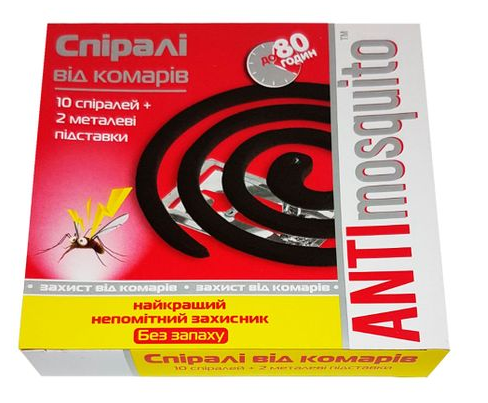 Спіраль - інсектицидний засіб, що містить речовини, які знищують комарів. Продукт є безпечним для людини. Час горіння однієї спіралі становить 10 годин. У комплект входить дві спеціальні підставки.