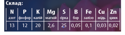 • Містить дві форми азоту для росту рослин: доступний фосфор продовженої дії для кореневої системи; чистий калій; вміст сірки та мікроелементи - залізо, магній, цинк, бір, які дуже цінні для рослин - ефективно впливають на ріст кореневої системи, імунітет рослин, зменшують негативні стреси.