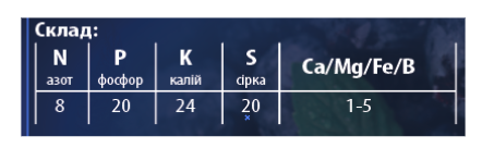Склад: азот (N) - 8%, фосфор (Р2О2) - 20%, калій (К2О) - 24% + сірка + МЕ.
