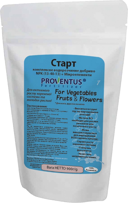 Комплексне водорозчинне добриво Старт застосовується для кореневого та позакореневого підживлення розсади овочевих та плодово-ягідних культур, з метою зростання та розвитку кореневої системи молодих рослин. Дане добриво містить у складі комплекс мікроелементів для збалансованого харчування в оптимальному співвідношенні та легкодоступній для рослин формі: азот (N) – 13%, фосфор (Р) – 40 %, калій (К) – 13%.