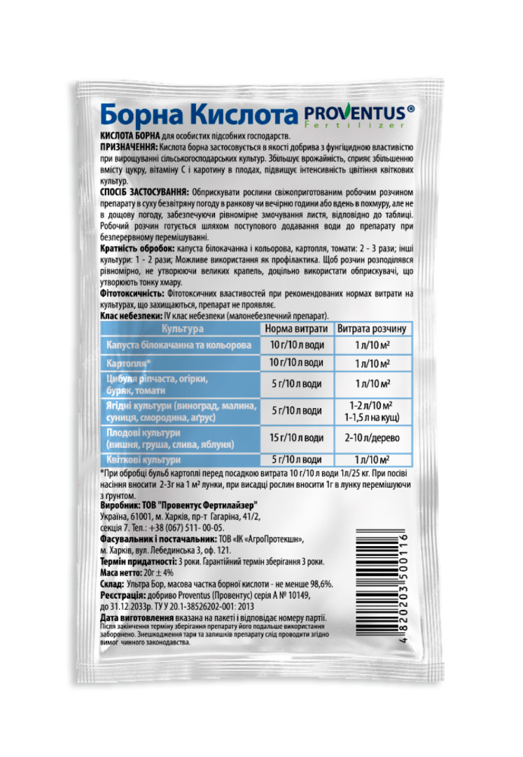 Призначення: Борна кислота, застосовується в якості добрива з фунгіцидною властивістю при вирощуванні сільгосп культур. Збільшує врожайність, сприяє збільшенню вмісту цукру, вітаміну С і каротину в плодах, підвищує інтенсивність цвітіння квіткових культур.