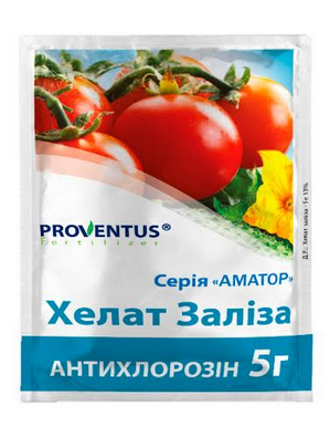 Призначення: спеціальне добриво у формі водо-розчинного порошку, який містить залізо. Стимулює вироблення хлорофілу, підвищує продуктивність фотосинтезу і попереджає виникнення хлорозу на рослинах. Застосовується при позакореневих підживленнях, а також методом фертигації в теплицях при вирощуванні рослин на органічних і мінеральних субстратах. Збагачує рослину - залізом у високій концетрации. При вирощуванні рослин на мінеральних субстратах можливе використання в крапельному зрошенні.