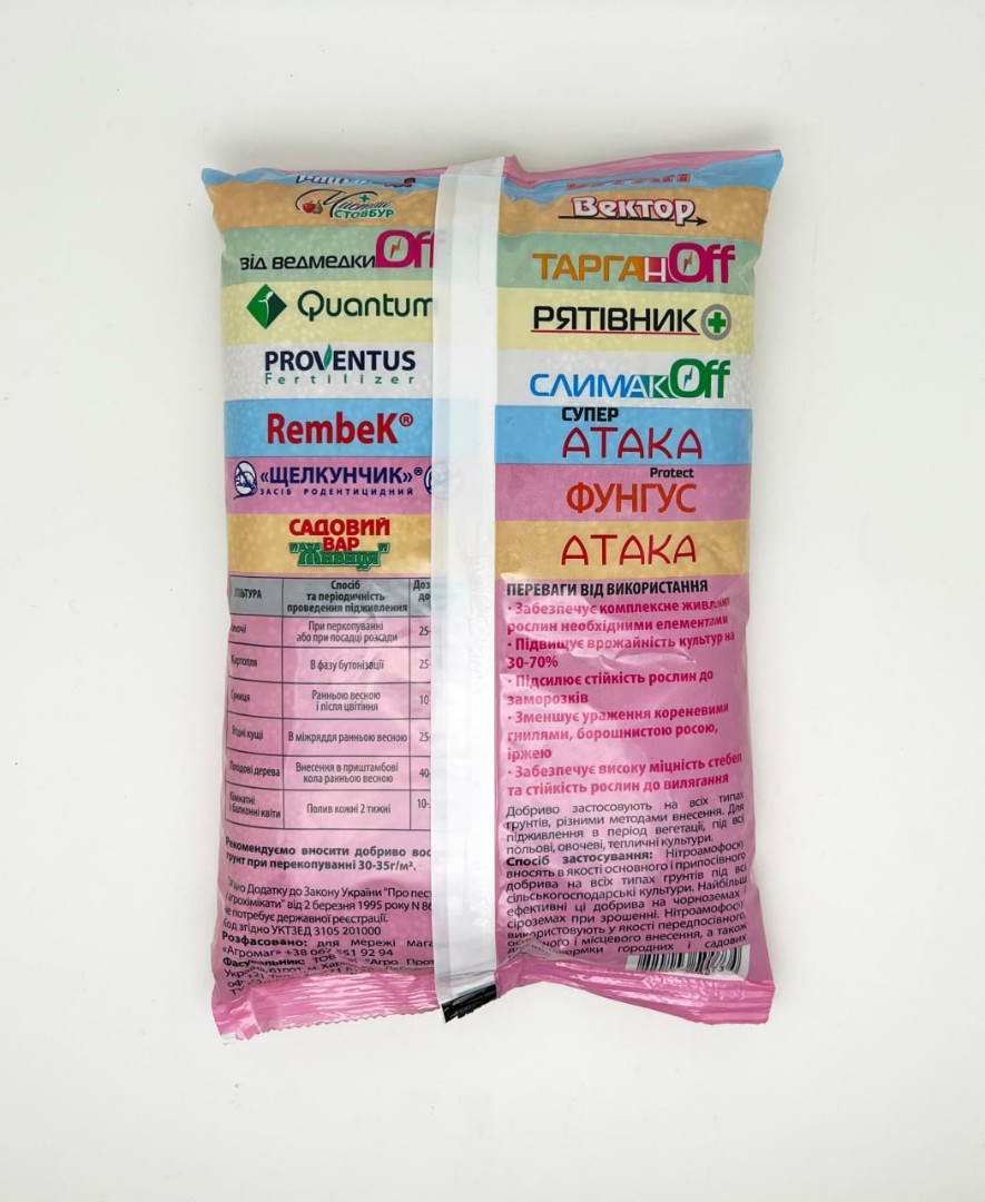 Високоефективне комплексне азотно-фосфорно-калійне добриво, що містить в засвоюваній формі основні живильні елементи, необхідні для росту і розвитку рослин - азот, фосфор, калій. Особливо ефективно на глиняних, піщаних і торф'яно-болотних грунтах.
