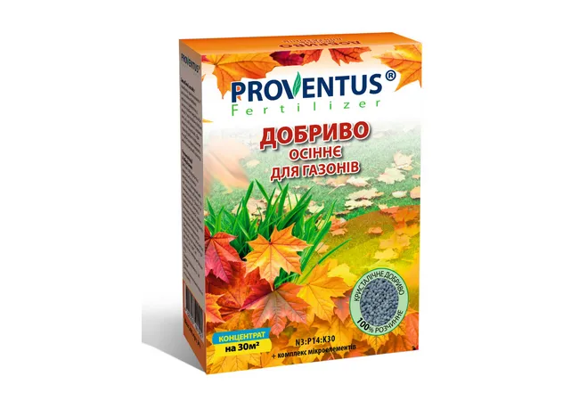- Підживлення газону. Використовують осінні добрива з підвищеним вмістом фосфору та калію та мінімальною кількістю азоту. Наприклад, Провентус осіннє добриво для газонів, Комплексне осіннє добриво тривалої дії для газону. Калій зміцнює коріння та підвищує морозостійкість. Фосфор сприяє розвитку підземної частини рослин. Підживлення вносять після останнього покосу та поливу, щоб поживні речовини встигли засвоїтися до промерзання ґрунту.