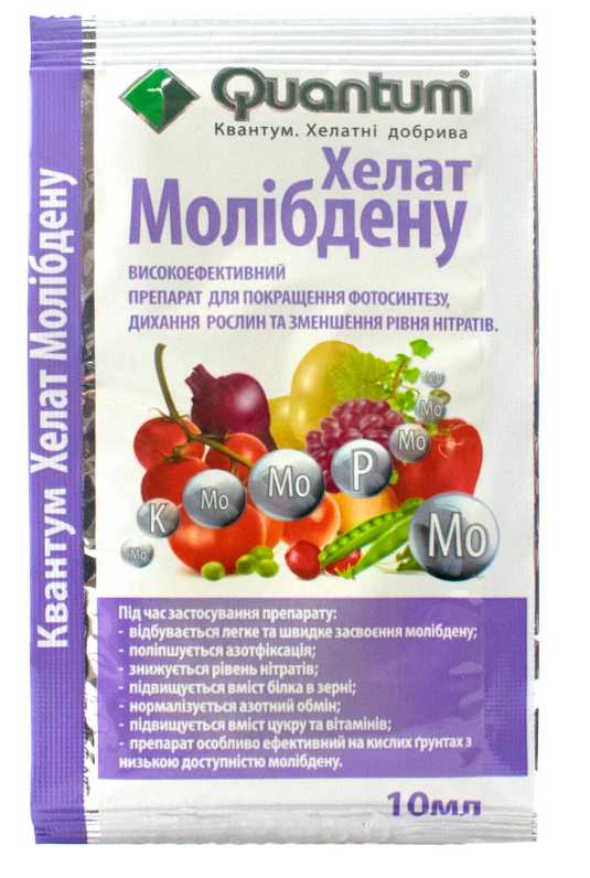 Концентроване молібденове мікродобриво, що містить молібден у хелатній формі. Застосовується для підживлення всіх культур з метою профілактики та усунення дефіциту молібдену. Особливо ефективне застосування на кислих ґрунтах (рН<5.5) та для бобових культур (соя, горох, люцерна та інші). Завдяки хелатній формі, препарат добре засвоюється рослинами.